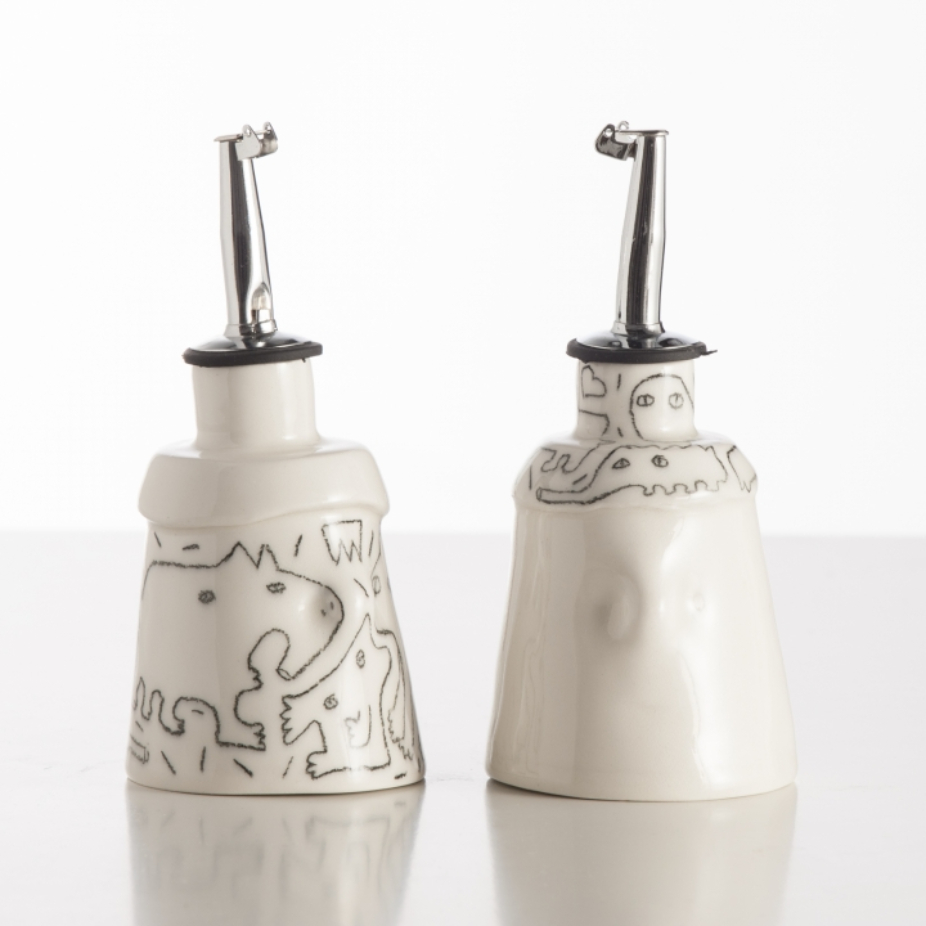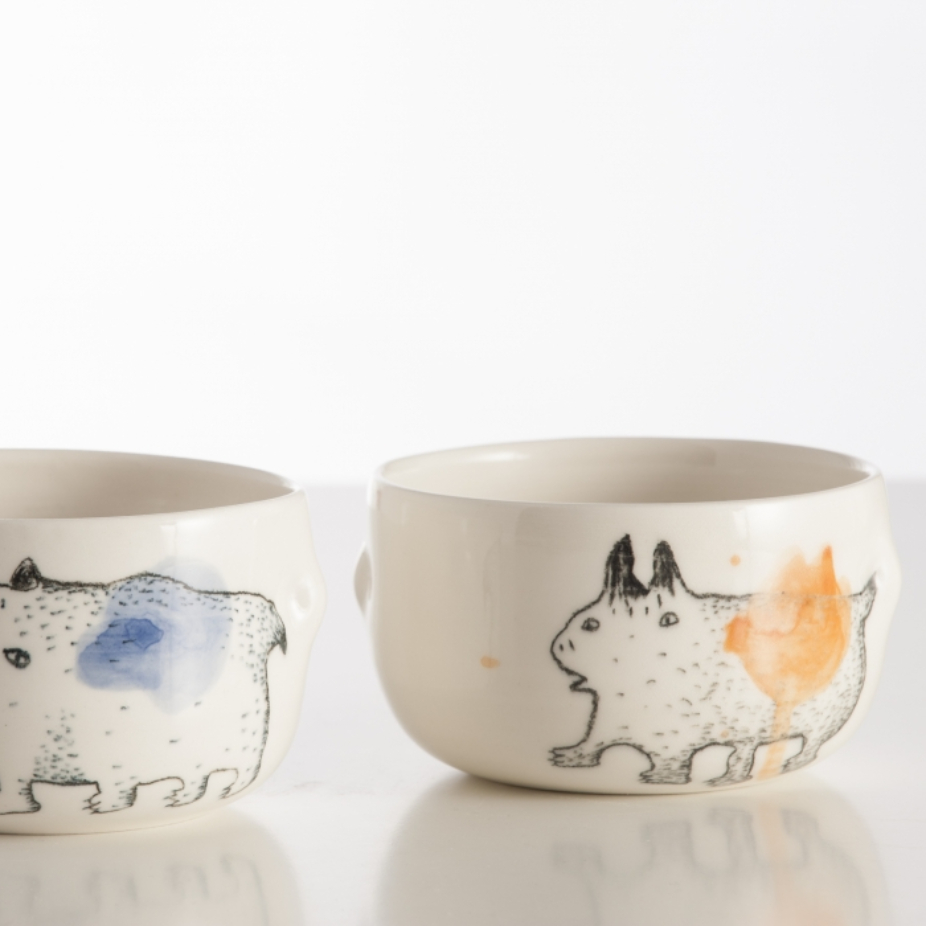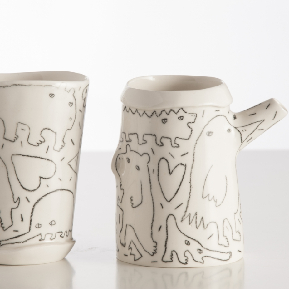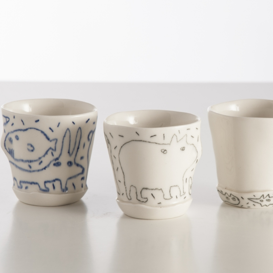 Le travail en céramique de Paul Guidera évoque de façon générale la naïveté et la spontanéité. Par un trait qu’on pourrait juger enfantin, Paul dessine partout et sans cesse des monstres – mais de gentils monstres ! Au gré de son imagination et des histoires, l’artiste rajoute chaque jour des créatures à son bestiaire imaginaire. Paul s’inscrit donc dans un rapport illustratif de la céramique mais ses pièces sont aussi conçues pour être utilisées au quotidien. Humbles, parlantes et ludiques, Pauline souhaite qu’elles touchent autant les adultes que les enfants.