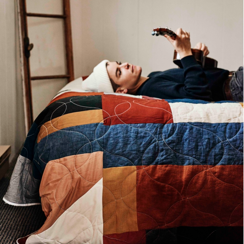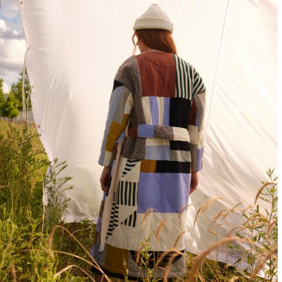 Couvertures de lit et accessoires en courtepointe, à partir de fibres surcyclées de coton, lin, laine et polyester. Les pièces sont réalisées en mini séries ou pièces uniques.