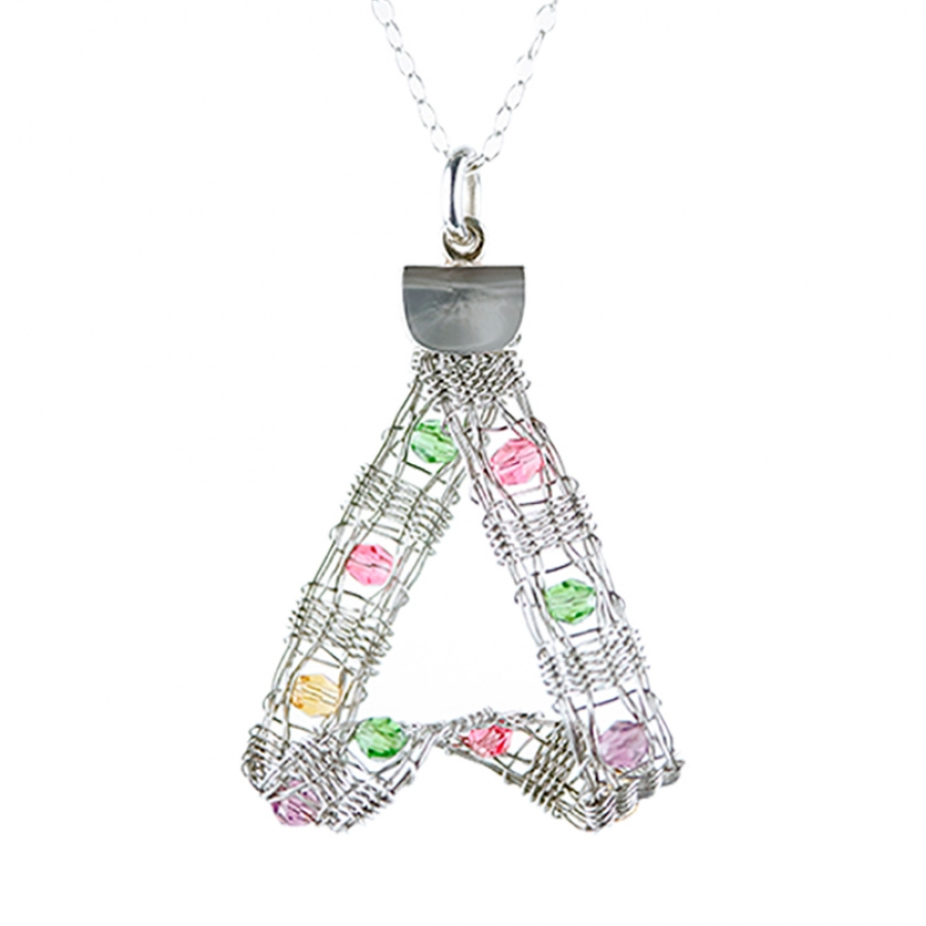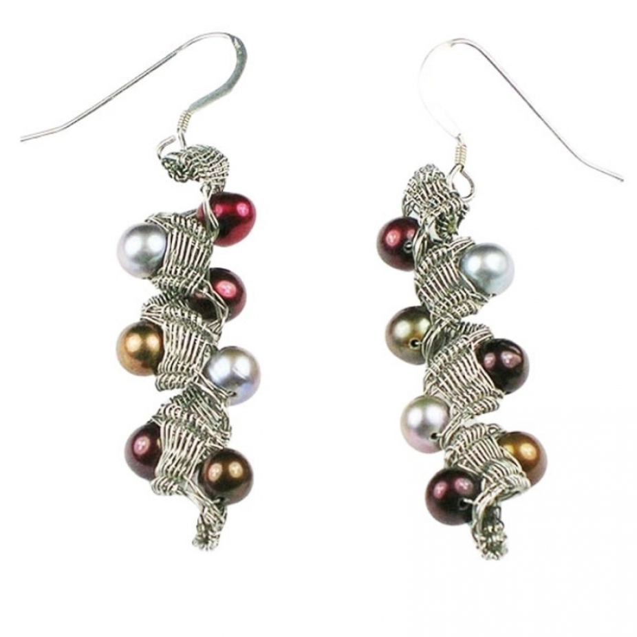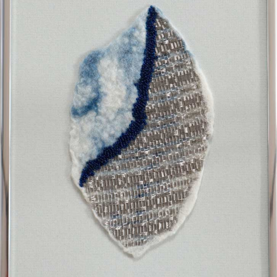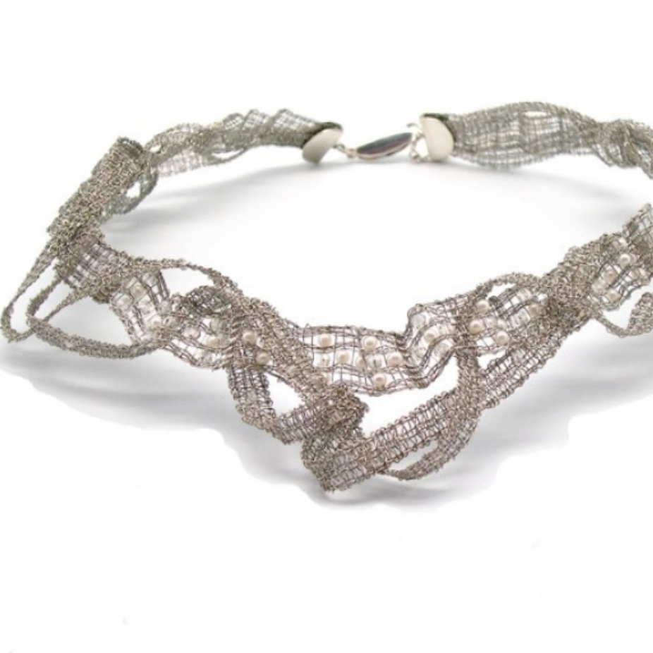 Bijoux tissées en acier inoxydable Sculptures avec tissage d’inox et autres matériaux Tableaux mélangeant du tissage d’acier inoxydable, feutre, macramé, insertion de perles et autres techniques provenant du textile.