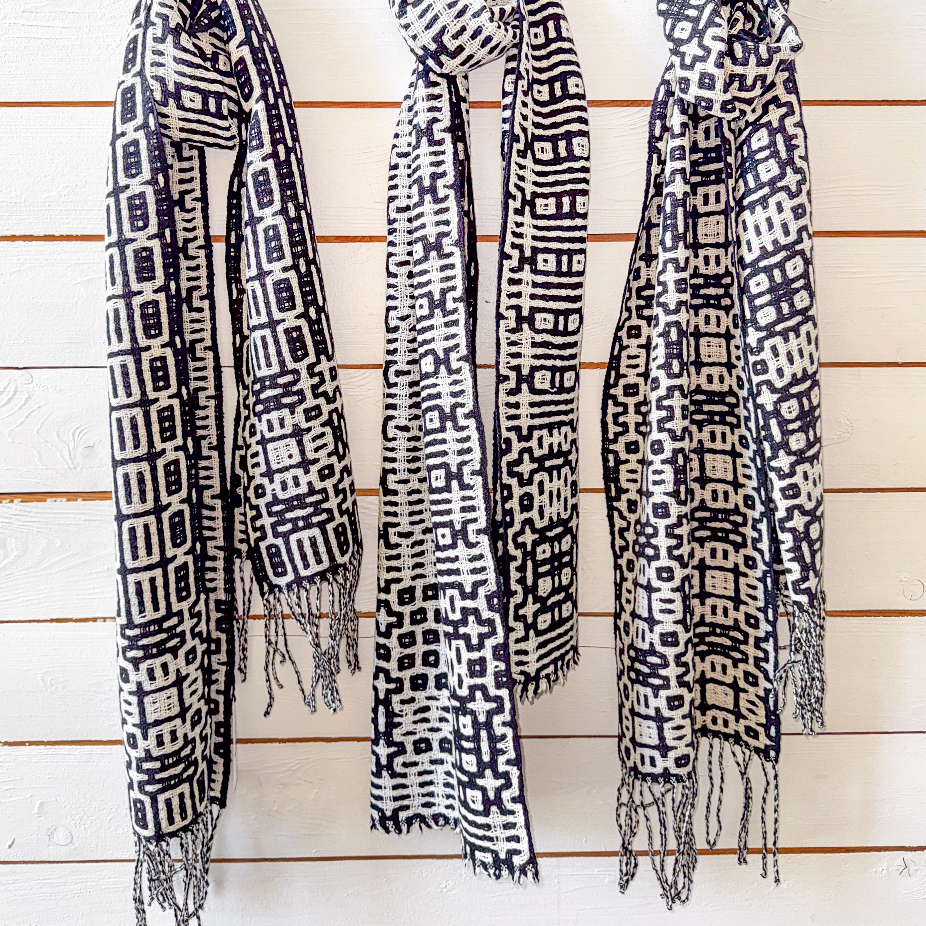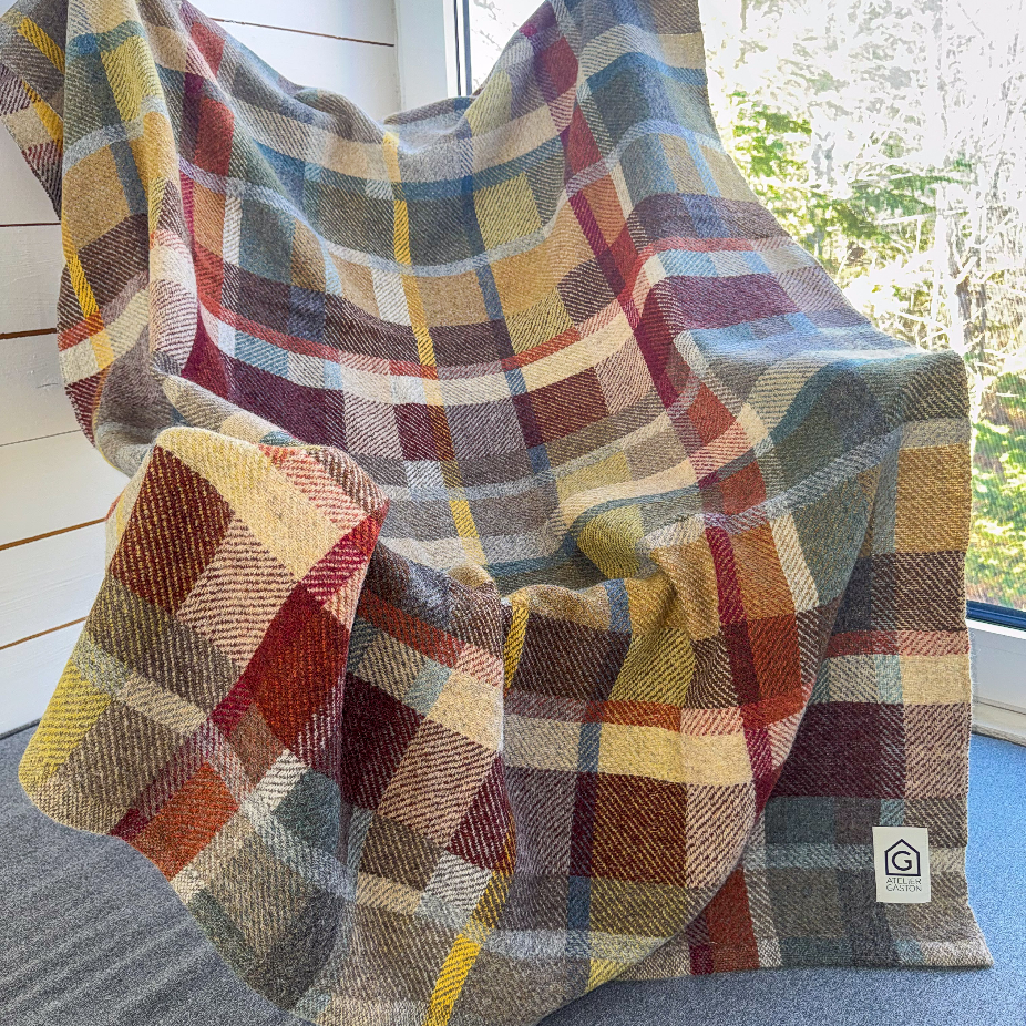 Objets utilitaires en laine 100% vierges, lin et coton, réalisés en exemplaire unique et petite série par des techniques de tissage : couvertures, nappes, foulards, écharpes, châles.