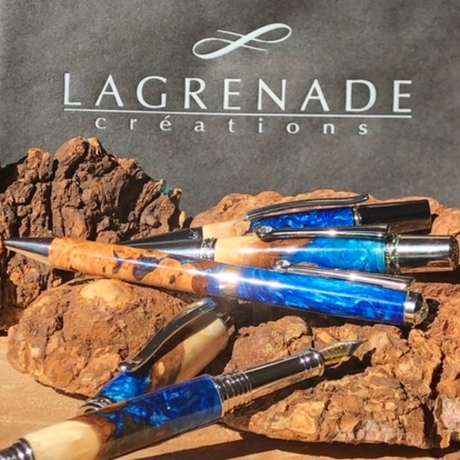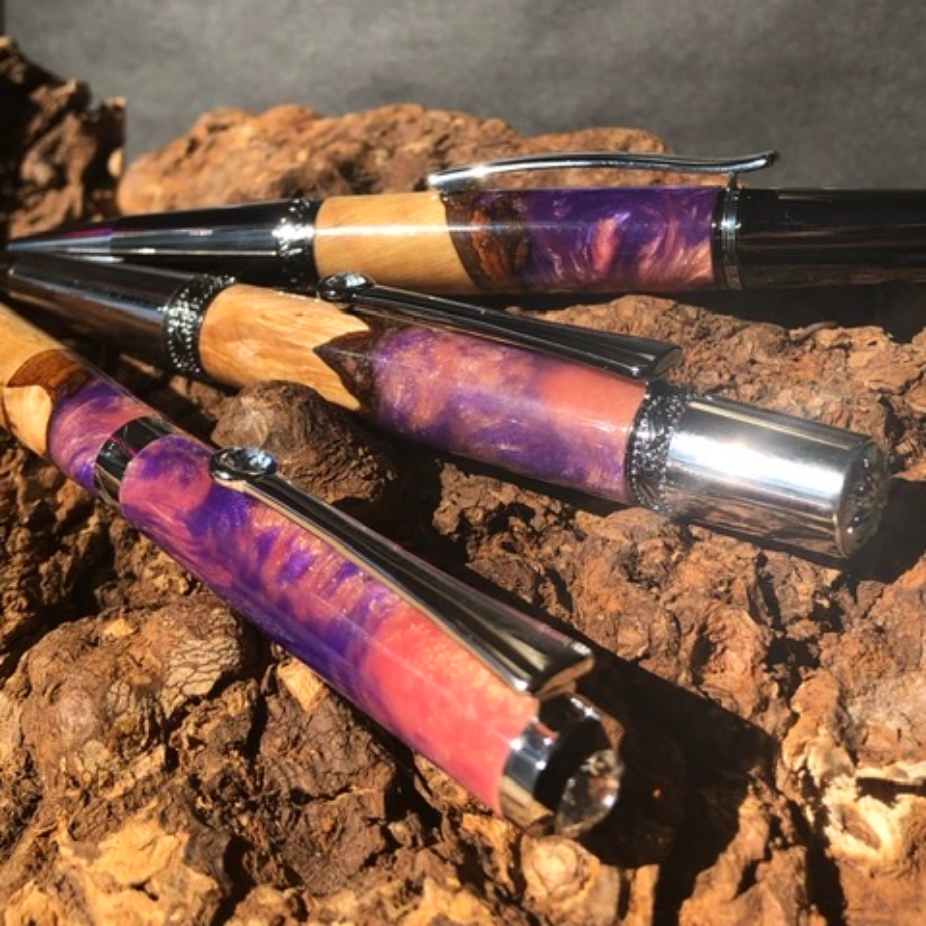 Stylos et plumes fait de fusion de loupe d’érable et acrylique, bois d’exception, acrylique, bois avec insertion de pierres semi-précieuses. Bijoux, collier en fusion de bois d’érable et résine.