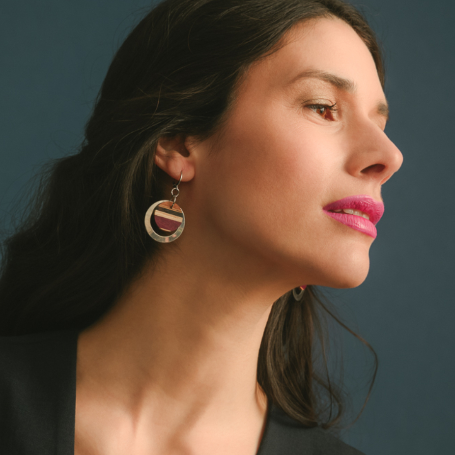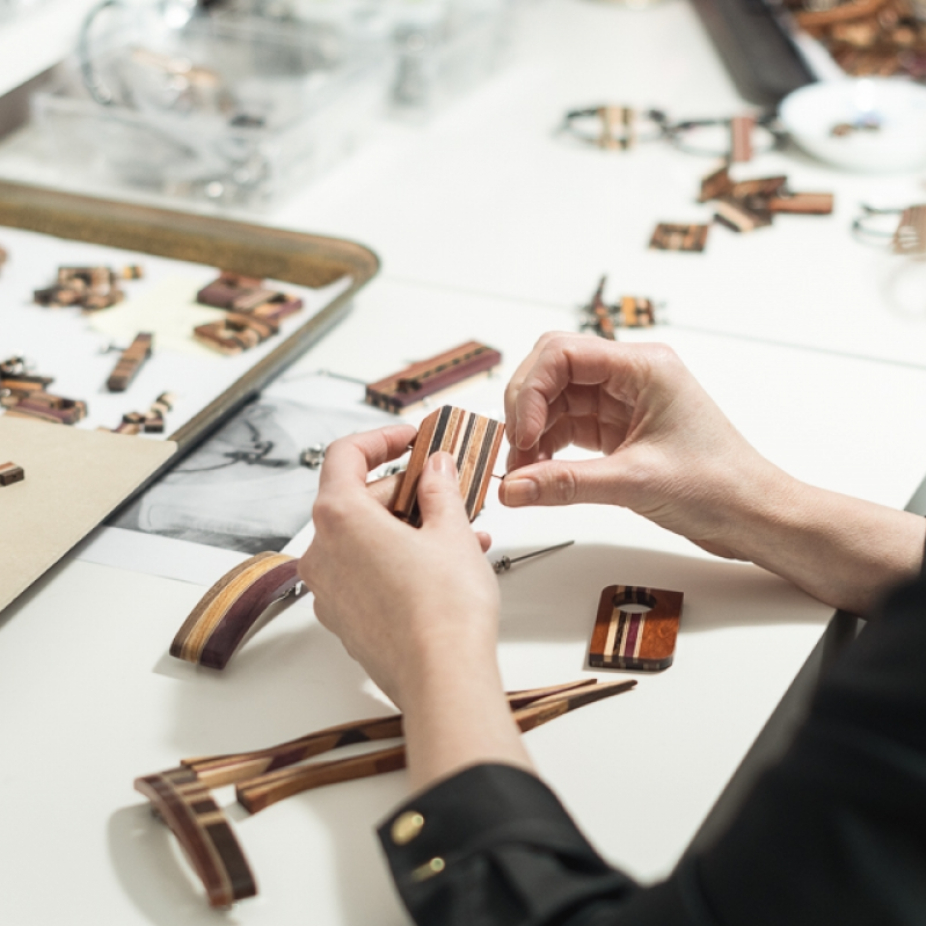 Bijoux et accessoires en bois. Isabelle Ferland exploite les motifs, les couleurs, les textures de différentes essences de bois comme l’amarante, le satiné rubané, le wengé et le zébrano. Elle en fait des mosaïques à partir desquelles elle conçoit des pièces originales, qui allient élégance et design contemporain. Sa collection, entièrement faite à la main, comprend des colliers, des boucles d’oreilles, des bracelets, des barrettes, des pinces à cheveux et des baguettes à cheveux. Son travail solitaire soigné lui permet de veiller personnellement à toutes les étapes de la création et de la confection de ses bijoux et accessoires.