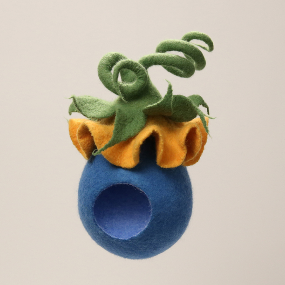 Objets utilitaires et décoratifs en feutre, réalisés par des techniques de feutrage de laine : veilleuse, mobiles pièces montées, lutins de Noël, fées, marraires, lutins feuilles, porte-clés et pochettes.