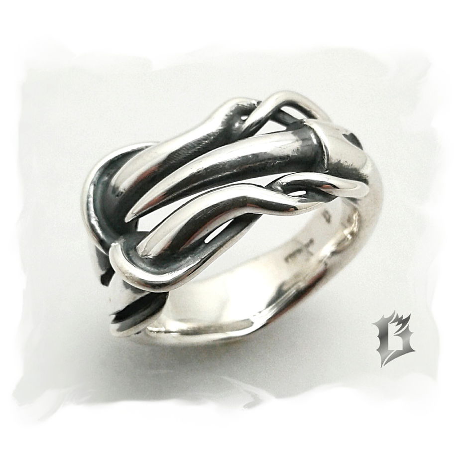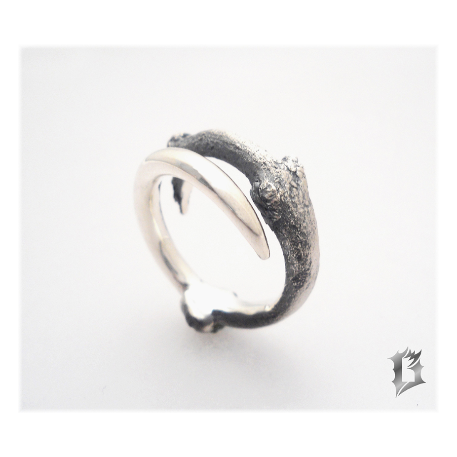 Il utilise principalement l’argent sterling oxydé ou l’or. La présence de ces deux métaux dans un même bijou donne aussi un contraste très intéressant.